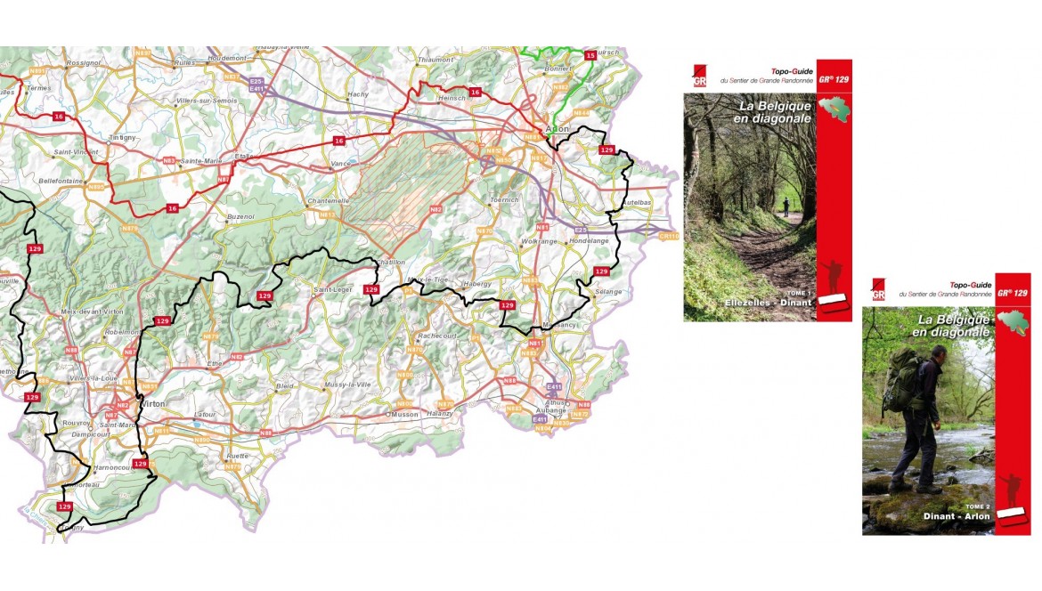 Le randonneur peut partir de Bruges et rejoindre Arlon en suivant les du GR® 129 « Dwars door België - Vlaanderen » (118 km), puis du GR® 129 « La Belgique en diagonale ! » décrit en deux tomes (192 km d’Ellezelles à Dinant et 263 km de Dinant à Arlon).