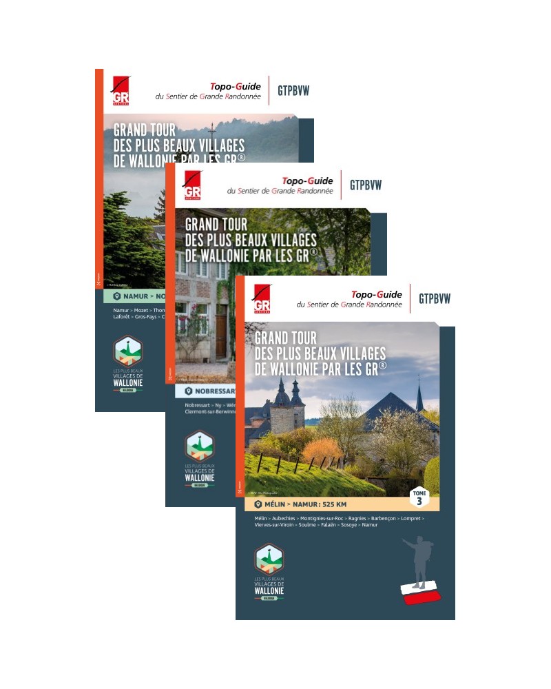 Ce pack regroupe les trois tomes, vous invite à parcourir la Wallonie et ses régions si particulières avec pour objectif la découverte de nos villages labellisés « Plus Beaux Villages de Wallonie » qui font la fierté de leurs habitants et des Wallons amoureux du patrimoine. Cet itinéraire s’appuie sur le réseau GR et déroule un tapis long de 1500 kilomètres reliant ces 32 villages de caractère. De manière plus espacée, une balise spécifique GTPBVW jalonne le parcours. Vous sillonnerez des paysages magnifiques et des contrées parfois mal connues, mais qui, à chaque fois, vous feront découvrir des endroits enchanteurs, logés dans un environnement naturel riche, des endroits préservés où le patrimoine bâti fait résonner l’histoire de nos ancêtres.